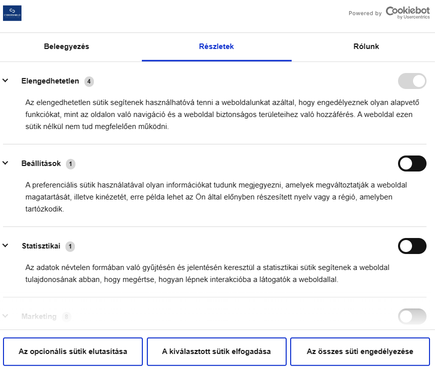 A sütikkel kapcsolatos részletes és naprakész tájékoztatás a weboldal látogatásának első alkalmával (vagy a böngészőben a sütik törtlését követő, a weboldal újabb meglátogatása alkalmával) felugró ablak „Részletek” menüpontjában, továbbá a jelen sütitájékoztatóból található, melyek tájékoztatást nyújtanak a weboldalunkon használt sütik működéséről, típusairól, a hozzájuk kapcsolódó adatmegőrzési időkről, az őket elhelyező szolgáltatókról, valamint adatkezelési tájékoztatójuk elérhetőségéről. A felugró ablakban (Cookiebot) az „Elengedhetetlen” típusú (működéshez szükséges sütik) sütiket kivéve a weboldalon alkalmazott többi sütifajták kezelését bármikor elutasíthatja, így az elutasított cookie-k a továbbiakban Önről adatokat nem gyűjtenek és nem kezelenek, ugyanígy azonban a hozzájárulás alapon működő cookie-k ismételt kezeléséhez bármikor hozzájárulást is adhat. A fenti körülményekről és azok megismerhetőségéről az alábbi (1. számú) ábra szerint felületen keresztül, annak menüpontjain belül kaphat információkat.